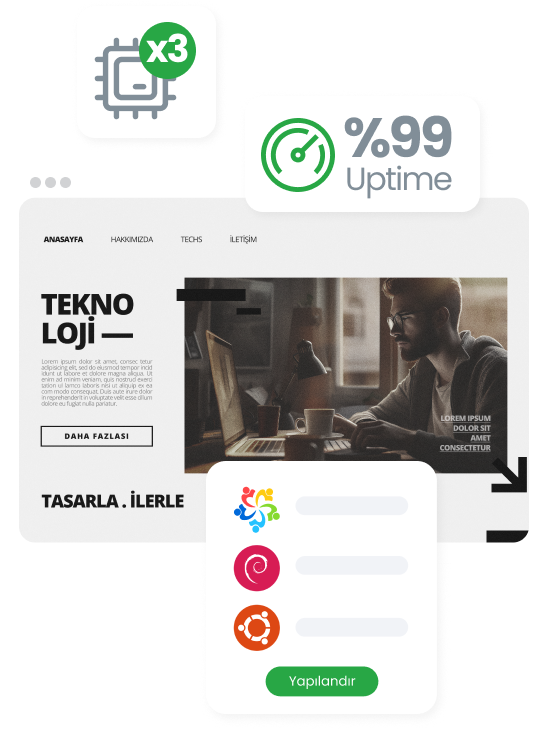 Esnek yapılandırma seçenekleri ile sunucunuza kurulması için dilediğiniz işletim sistemi ve kontrol panelini tercih edebilirsiniz. Bununla birlikte Veri tabanı, uygulamalar, güvenlik ve yedekleme seçeneklerini de yine sunucu yapılandırması sırasında belirleyebilirsiniz. Yaptığınız seçimlere göre sunucunuz hazırlanarak en kısa sürede teslim edilmektedir.